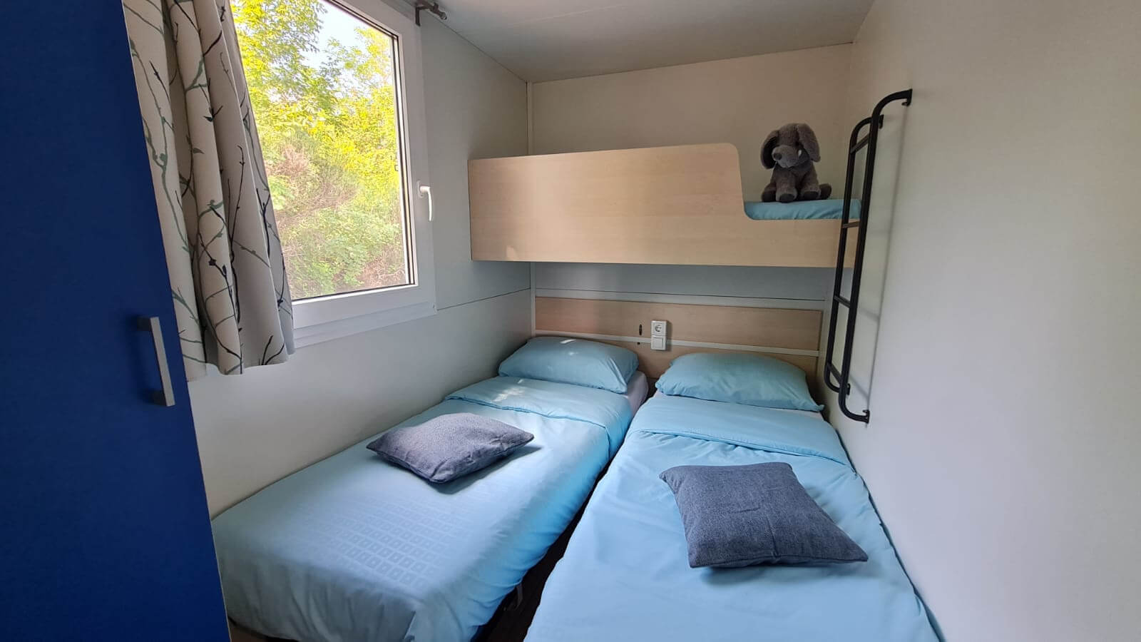 - Slaapkamer met 2 één persoonsbedden en kleine bovenslaper (1,6 mtr.).
