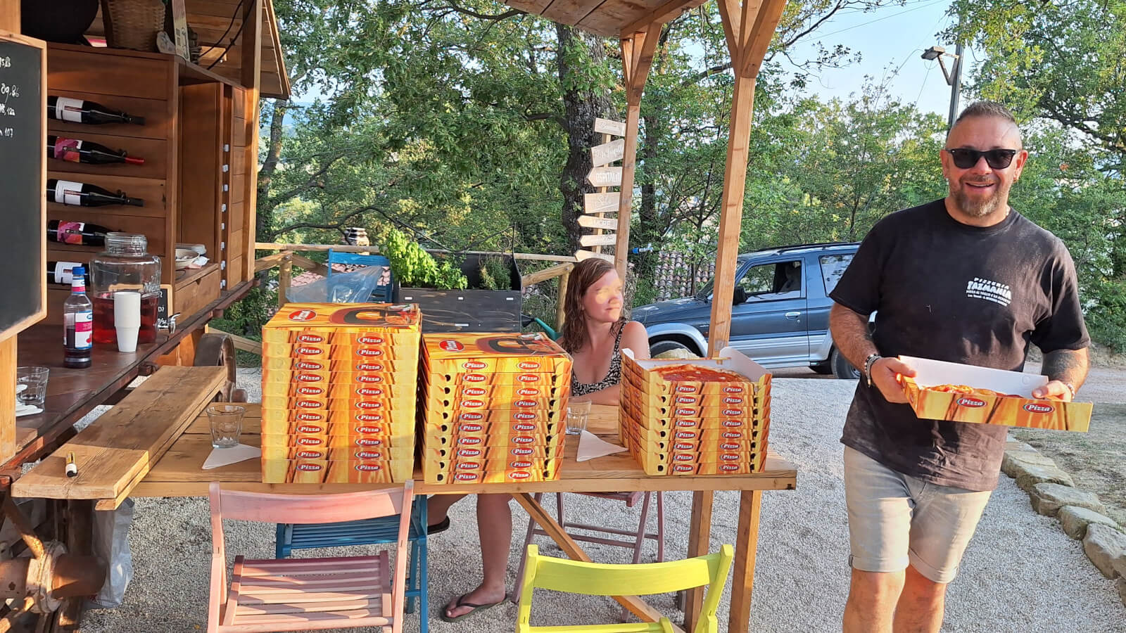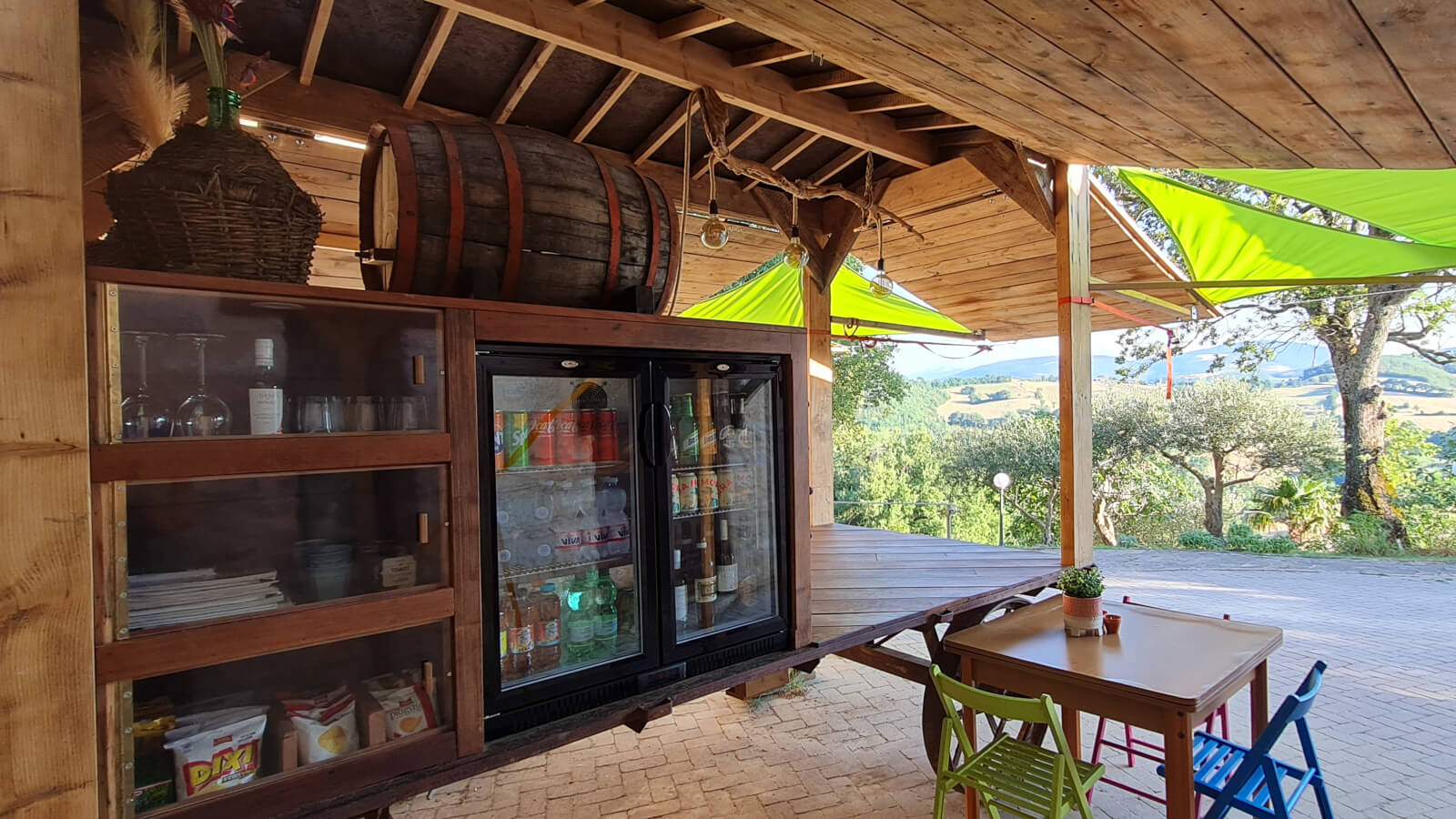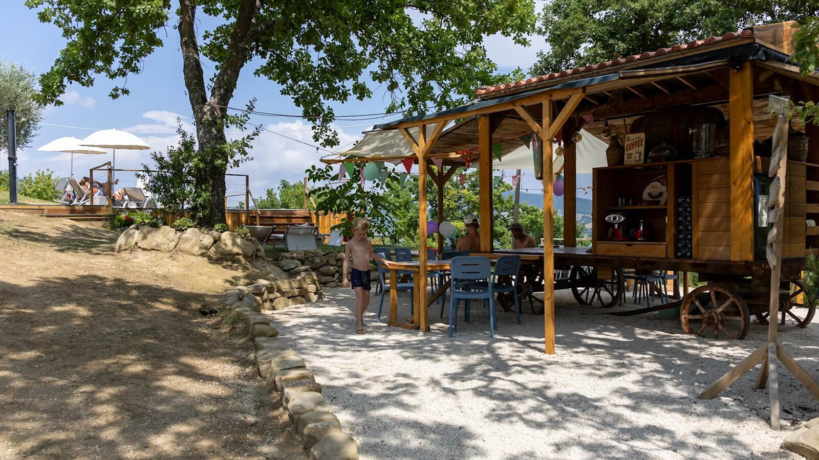 Drie vaste tafels met stoelen nodigen uit om even bij te praten met medecampinggasten. Of je nu zin hebt in een ontspannen ochtendkoffie, een verkoelend ijsje in de middag, of een gezellige avond met pizza en een glas wijn, de horecakar is hét kloppend hart van onze camping. Ook ideaal voor een gezamenlijke Italiaanse aperitivo of een spontane kennismaking met je buren!