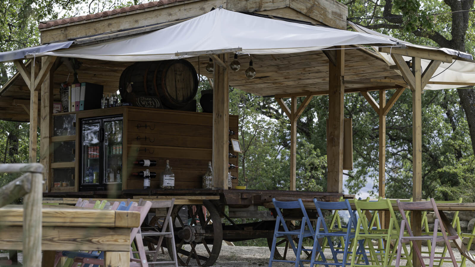Midden op de camping staat onze sfeervolle horecakar. Een gezellig ontmoetingspunt waar je onder de schaduwrijke bomen kunt samenkomen voor een drankje, een praatje of gewoon even lekker hangen. Het is de plek waar vakantievriendschappen ontstaan en verhalen worden gedeeld.