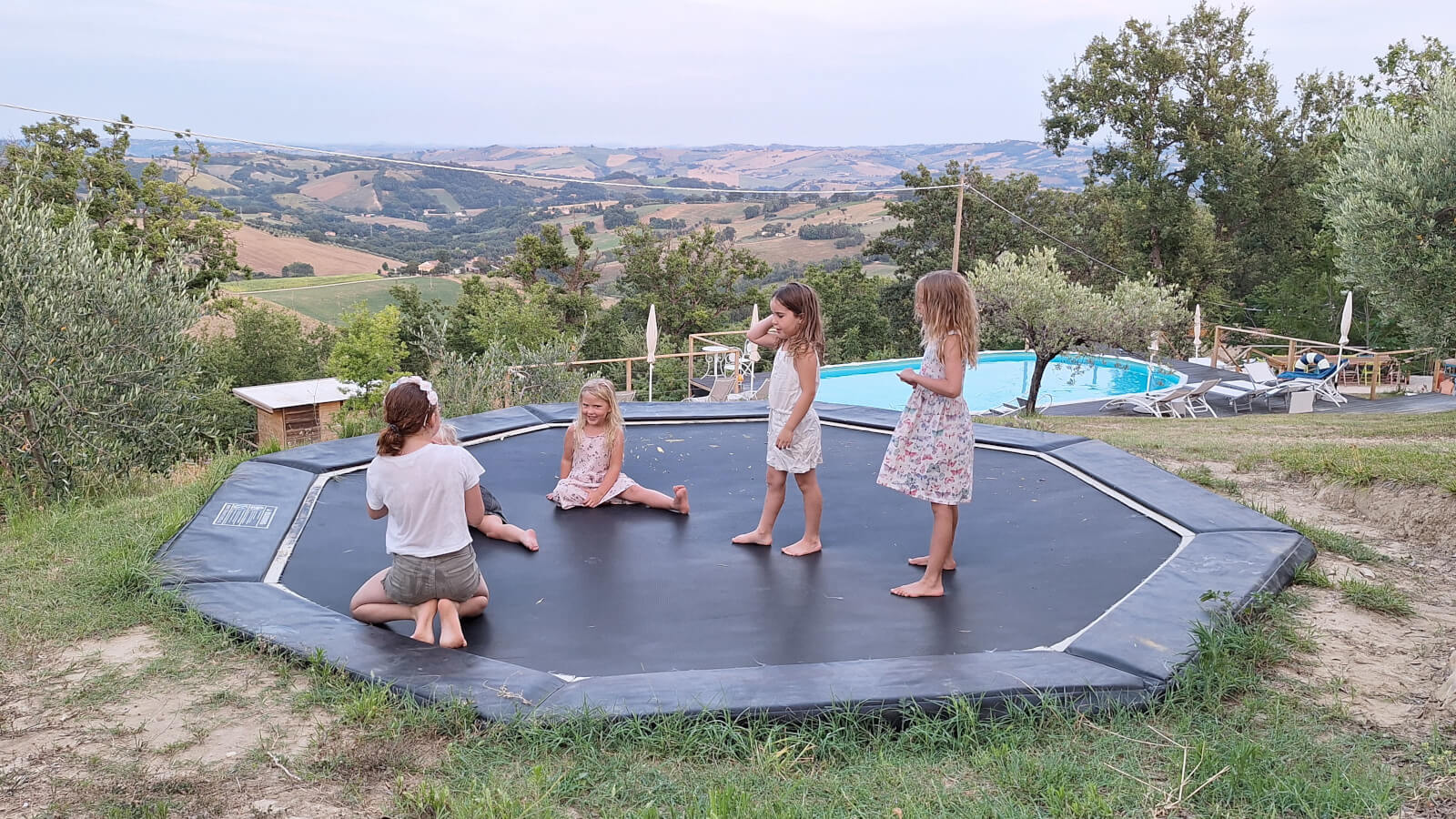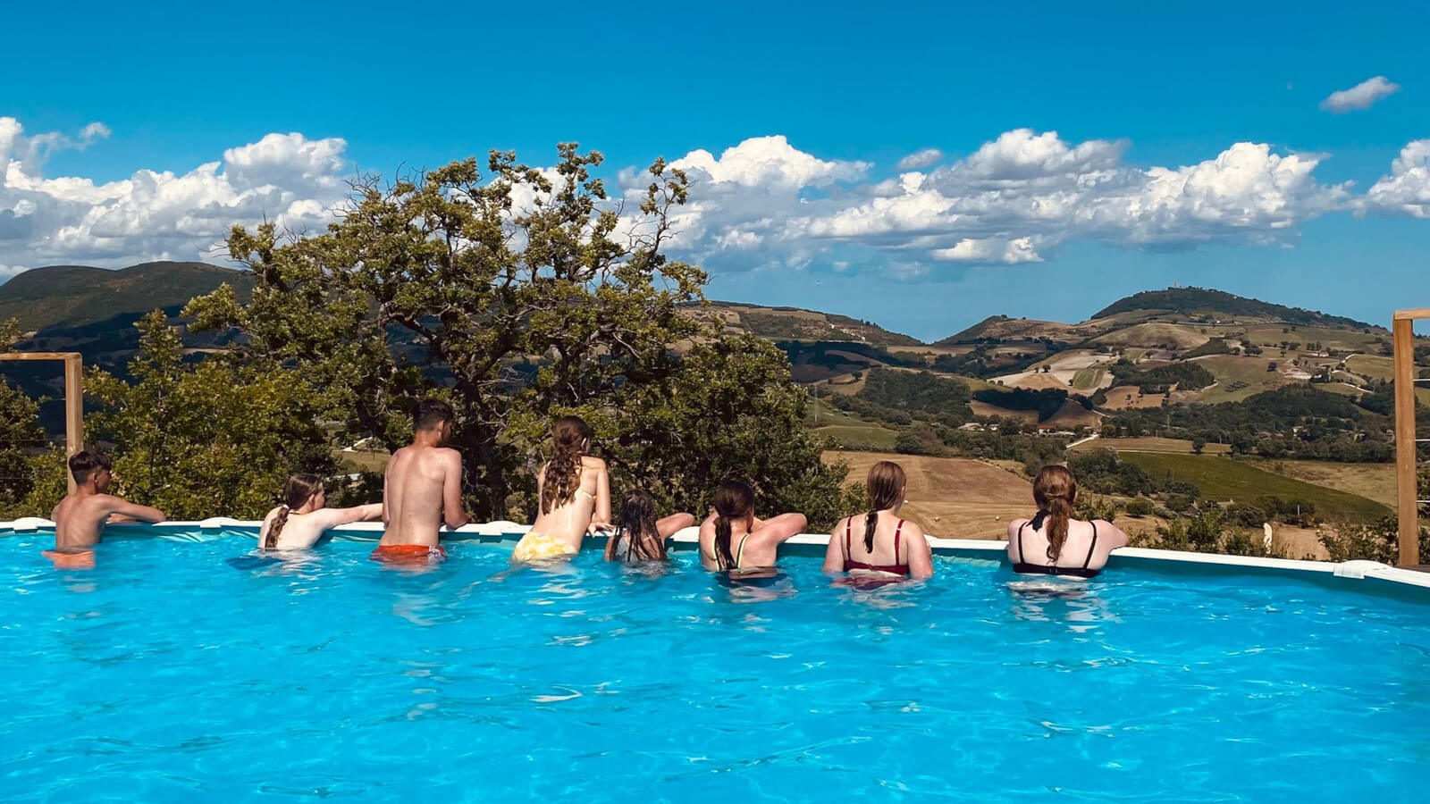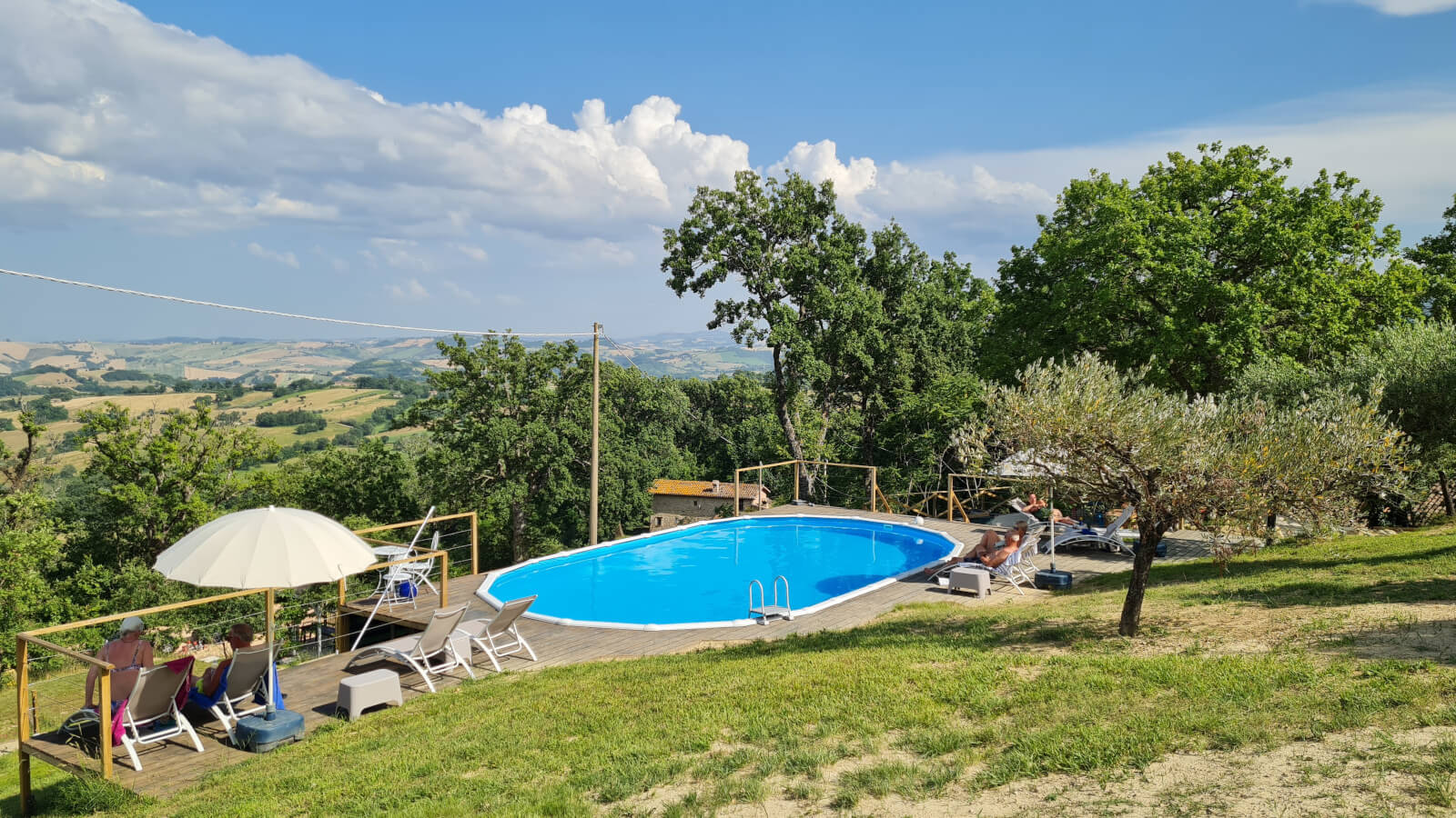 Het zwembad ligt centraal op de camping tussen de olijfbomen, waardoor het voor iedereen goed bereikbaar is. Vanaf het zwembad kijk je uit over de glooiende heuvels van Le Marche met in de verte de Sibillini bergen. Een mooi uitzicht om bij weg te dromen.